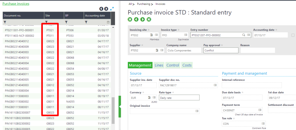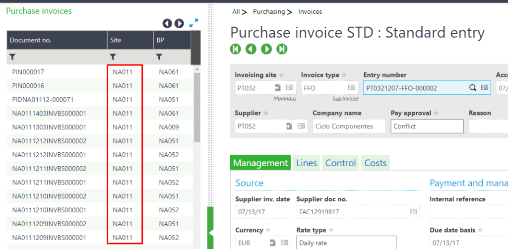 In the following example we are going to restrict the Purchase invoices on the left list to a specific site e.g. “NA011”. The setup principle will be the same for any function.
