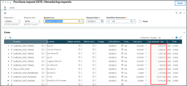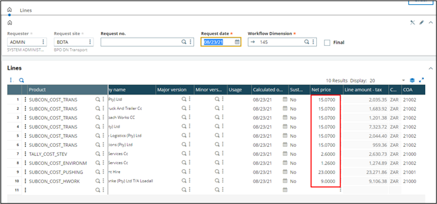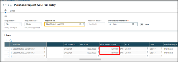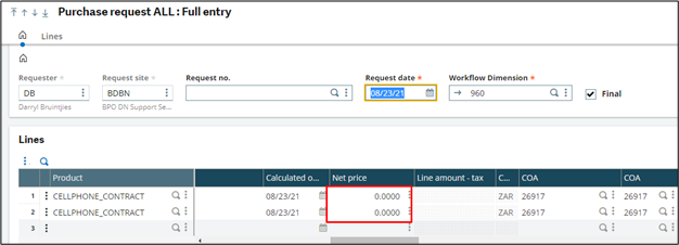 Step 4 – Now when you copy an existing Purchase request by clearing the Request number and tab once, notice that the system is keeping the existing prices on the lines.