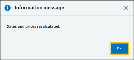 Step 2 – When you clear the Purchase request number and tab once, the below information message will pop up. Just click “Ok” and notice the Net price fields cleared out automatically. So the user will have to manually enter in each price on the lines.