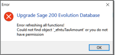 What to do when you get the Sage 200 Evolution company upgrade error “Error refreshing all functions! Could not find the object ‘_efntuTaxAmount’ or you do not have permission“