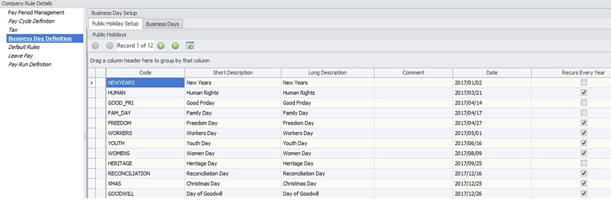 - Under Company Rule Details, select Business Day Definitions – Public Holiday Setup