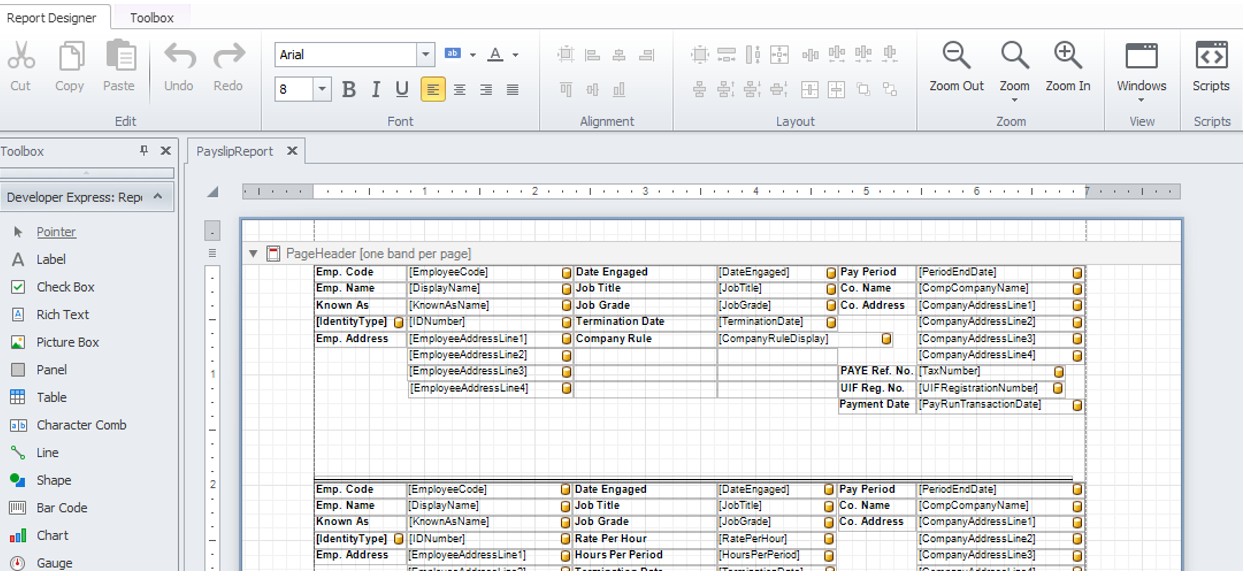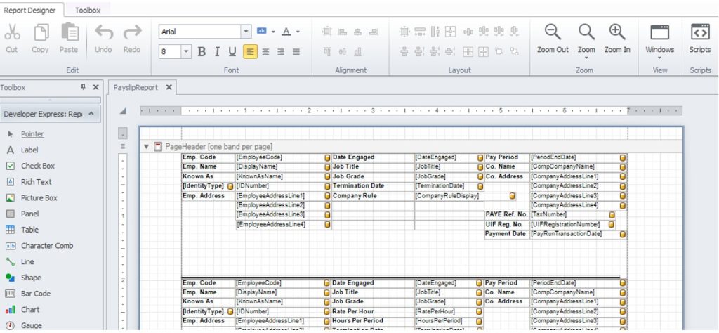 - Highlight your new payslip and choose “Report Designer” from the ribbon at the top of the screen