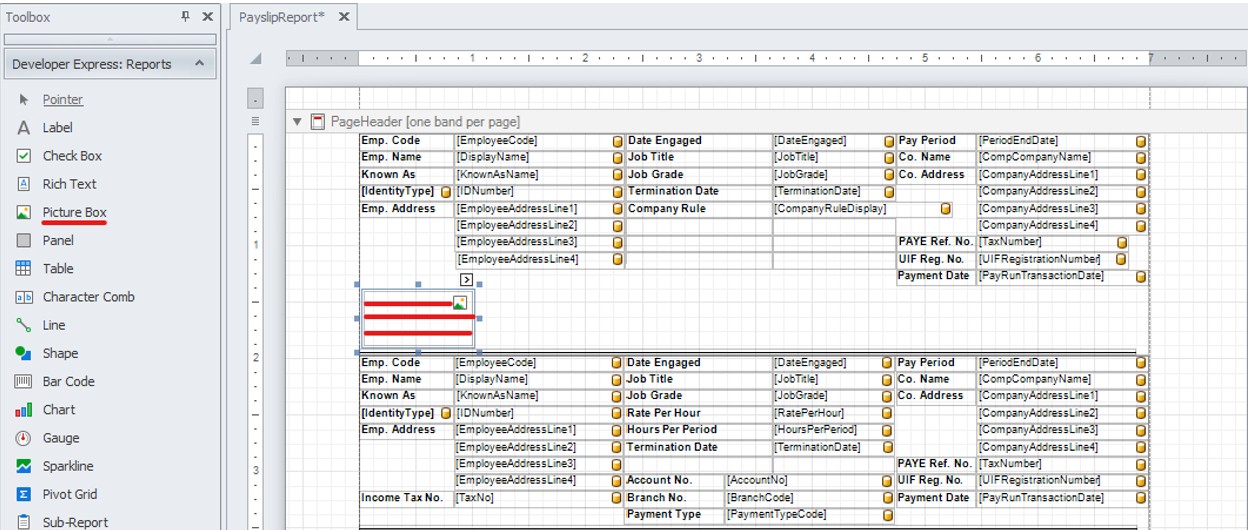 - Go to the payslip layout in the PayslipReport section and draw the area where you want to place the logo